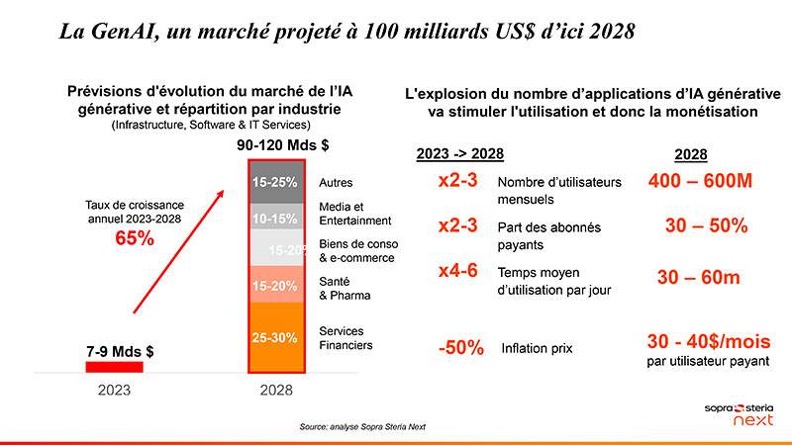 Le marché de l’IA générative devrait connaître une croissance exponentielle selon les prévisions du cabinet Sopra Steria Next (entreprise européenne des services du numérique et société de conseil). Une étude publiée en janvier indique un taux de croissance annuelle de 65%, dans les trois prochaines années, et une valeur de marché au 2028 dépassant les 100 milliards de dollars. Cette approche se fonde sur les projections d’évolution des capacités et des cas d’usages de l’IA générative en cours d’adoption dans les entreprises. Ce sont des prévisions toutefois qui risquent d’être basculées dans le scenario économique actuel, profondément modifié après l’investiture du président Donald Trump.