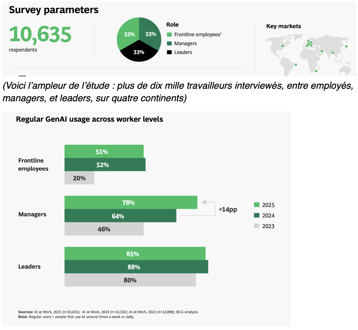 Les dirigeants d’entreprise et les managers sont les plus gros utilisateurs réguliers de l’IA générative, avec une forte augmentation de 2024 à 2025. Plus de la moitié des employés l’utilisent aussi.