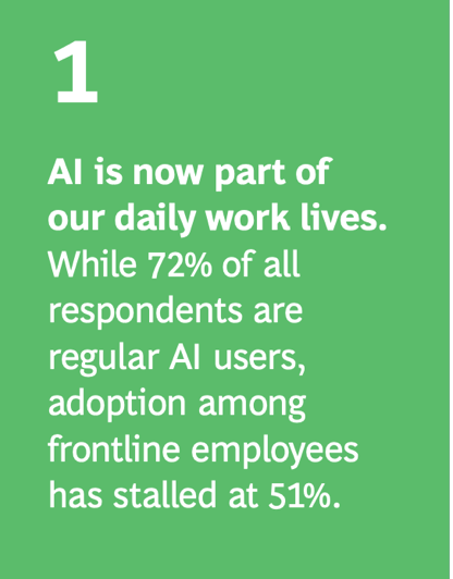 Pour l’instant, à niveau mondial, seulement 13 pour cent des entreprises ont déjà intégré les Agents IA dans leurs cycles de travail, révèle une vaste étude intitulée « AI AT WORK », réalisée en juin par Boston Consulting Group. Mais l’IA générative est largement adoptée : 72% des travailleurs de tous niveaux répondent de l’utiliser régulièrement.